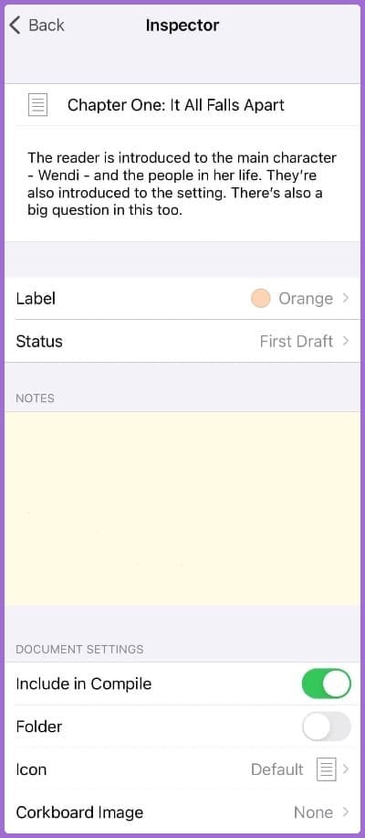 There’s something about Scrivener that makes it feel like you’re in your own, quiet corner where nothing can disturb your peace. Not only that, but another thing I’ve loved using (especially while working on my novel) is the Inspector tab.