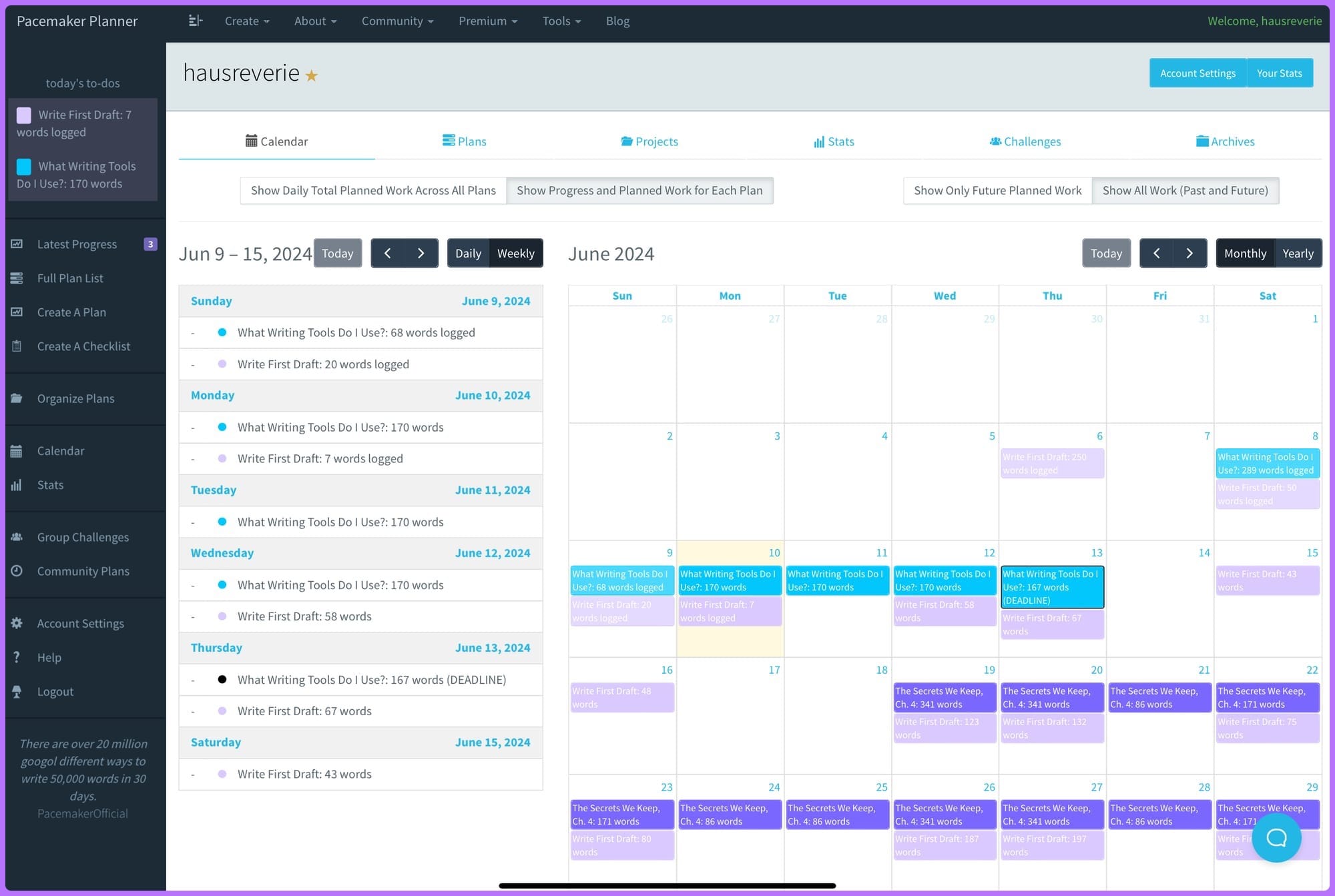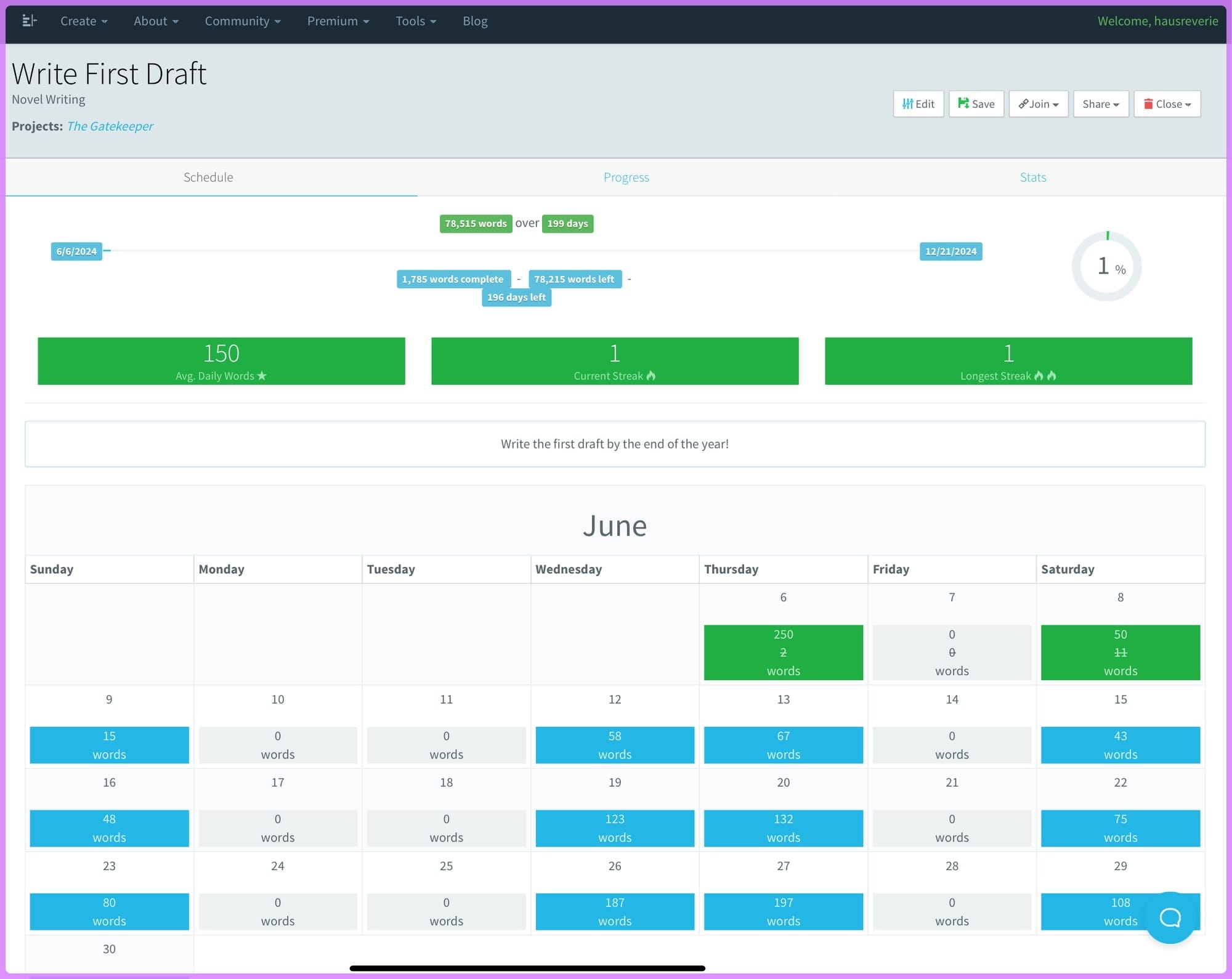 I’m able to customize the project to my needs. The computer estimates how many words each day I’ll have to write to meet my goal. I can even choose specific days I’m going to write (the days highlighted blue). I’ve been doing this routine for a few days now and seeing the progress is motivating me to continue.